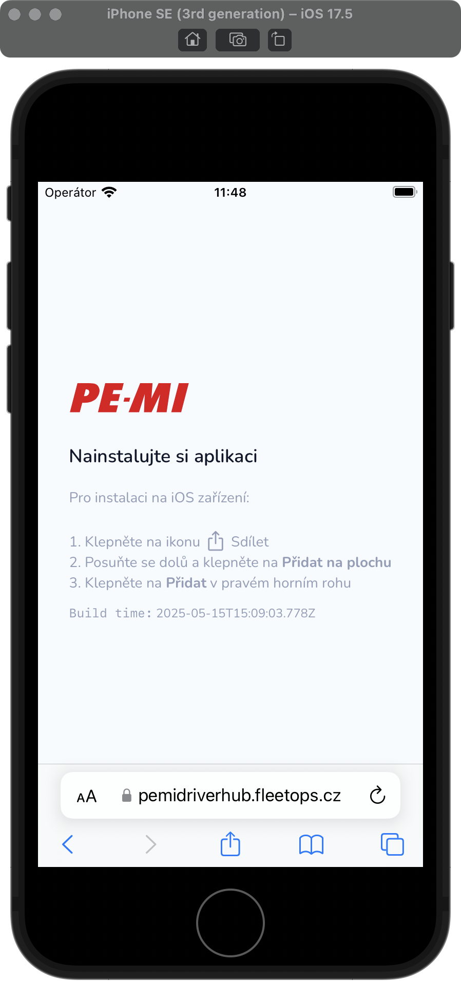 Aplikace PEMI DriverHub je dostupná jako PWA (Progressive Web App), což znamená, že si ji můžete snadno nainstalovat do svého telefonu stejně jako běžnou aplikaci – bez nutnosti jít do App Storu nebo Google Play.